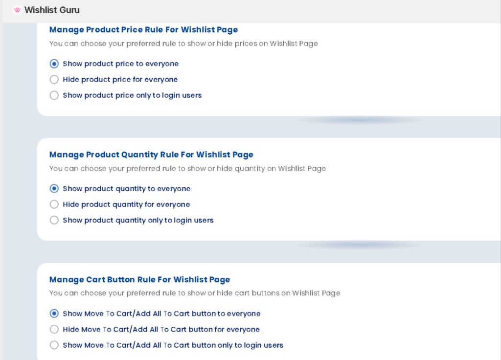 Wishlist Guru introduced this feature specifically for businesses that cater to B2B customers. These solutions give you more control over what data is shown to different types of users. Whether you want to keep pricing, product quantities, or purchasing options restricted to registered users only, these settings ensure that you can tailor your storefront to meet your business needs.