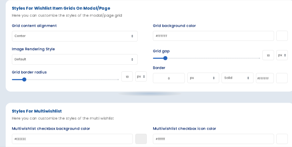 Note : Styles for Wishlist Item Grids are only for Modal and Page option