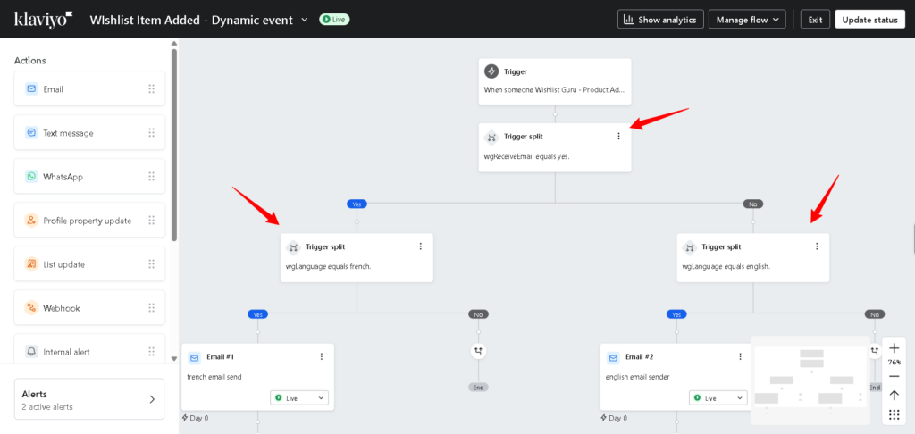 This flow first checks whether the customer has agreed to receive emails. If email consent is given, Klaviyo then sends the message in the customer’s preferred language, such as French or English, ensuring both compliance and personalization.