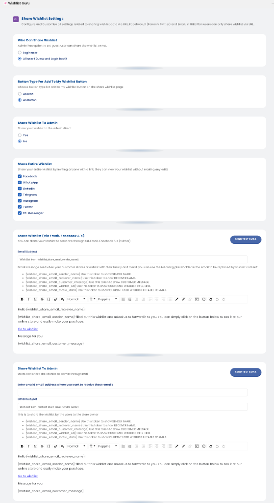 Wishlist Guru allows you to control how customers share their wishlists across different platforms such as URL, Email, Facebook, and X (formerly Twitter). You can decide who can share wishlists, how they appear, and which channels are available.